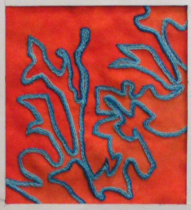 Here’s one more. I didn’t particularly like my first orange and blue study so I did another one. This has a background fabric of silk noil covered with silk organza. You can’t see it here but I got the pattern of stitching from the pattern of dye on the silk organza. I used stem stitch and did three rows to give it more weight. I was considering filling the blue shape completely in with stem stitch but I like the balance of blue to orange at this point so I think it’s done. So perhaps this is the last one, maybe…
