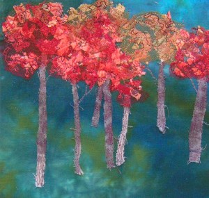 Here’s the finished sample. I liked this technique and I would have done more with the background if it was to be a finished piece but it’s just a sample. I have some ideas on creating a larger piece this way. Note to self, finish background before adding trees and foreground.