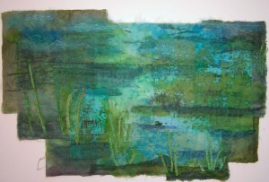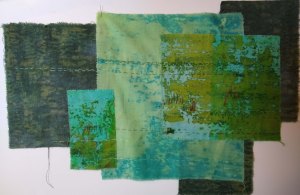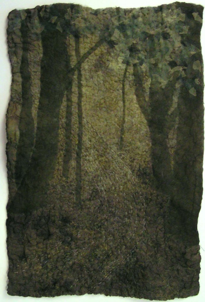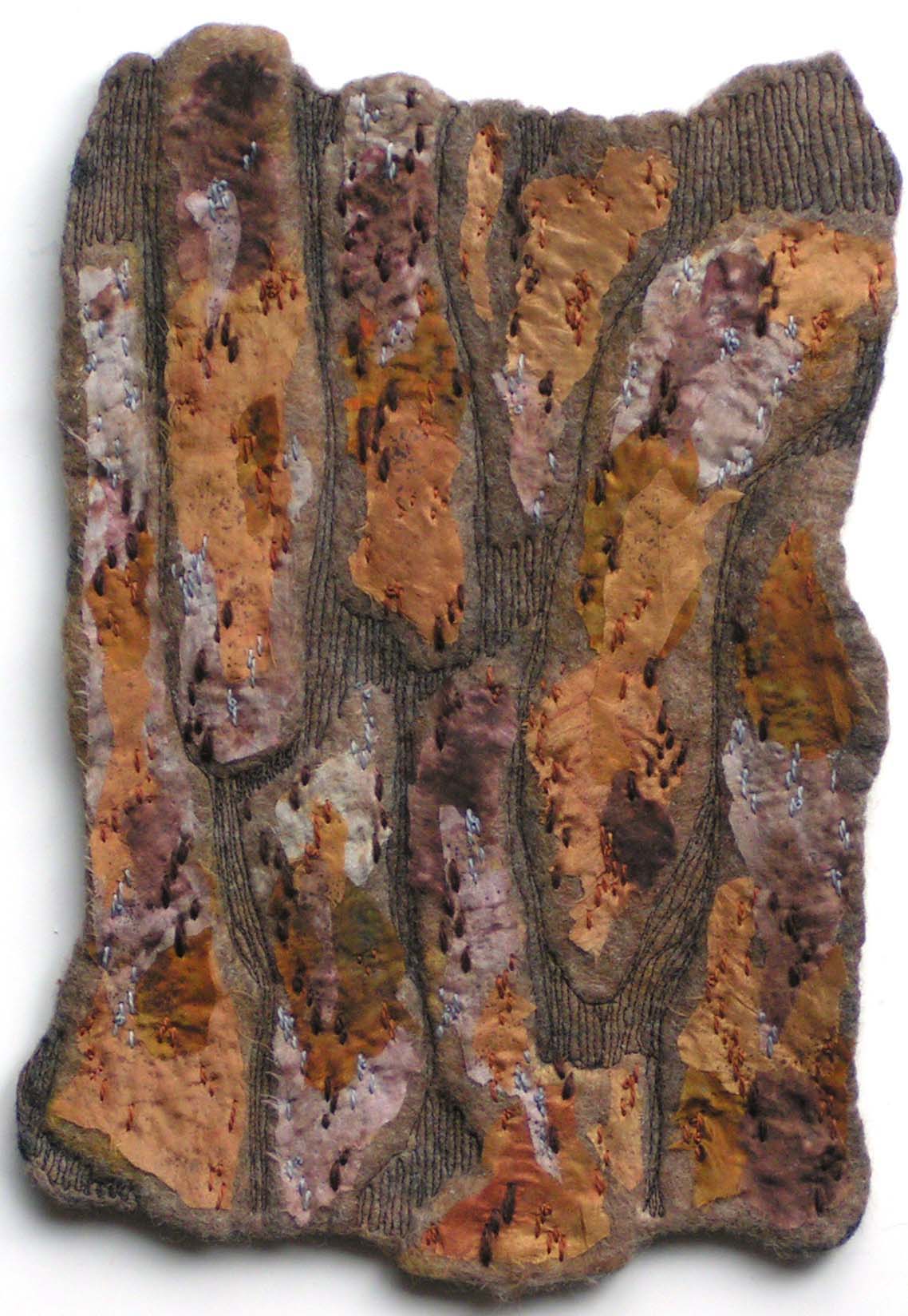 Here’s a photo of the resulting applique I created based on bark. I used a felt background with inclusions to give more volume to the raised areas. I then added a variety of silk applique and stitched down with hand dyed wool thread in a variety of colors. I then machine stitched the background to flatten those areas and give the piece more depth.