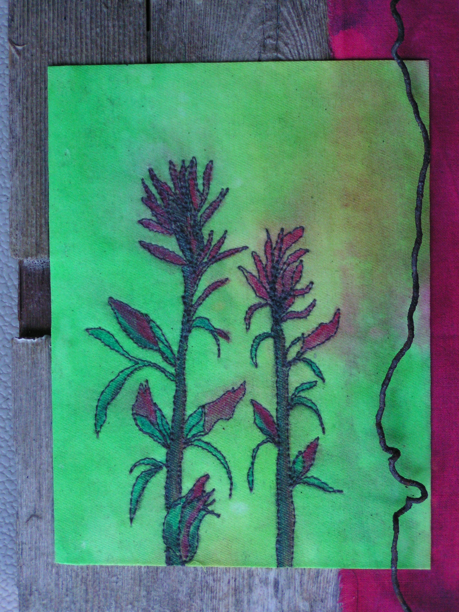 I love simplicity in design. It’s not easy to achieve but I always admire when a piece is taken back to the bare essence of an idea. So when Textileartist.org announced a challenge by Emily Jo Gibbs, I was intrigued with her style. The instructions were to find a stick or an object such as a paintbrush to be your inspiration. Then, sketch the item and use that sketch to create an applique. Ha! Applique is perfect for another homework assignment. Plus, the simplicity of using a sketch as the design. I have hundreds of sketches that I could use. But I found a stick, and did a sketch of it, including the shadow.