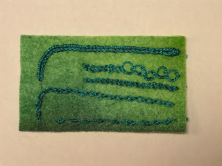 I worked on 8 different stitches today. (You can click on any of the photos to see the stitches more closely.) I wanted to try a few of the stitches that I hadn’t done before and see if any would be useful to me. For a stitch to be useful, it needs to be fairly straight forward and not take an age to work. The first stitch I tried was heavy chain stitch. Once I got going, it was an easy stitch. The most important part was to start with a long enough stitch so that you could thread the loop of the chain back through easily. I got off a little at the start but soon figured it out. It curves easily as well.