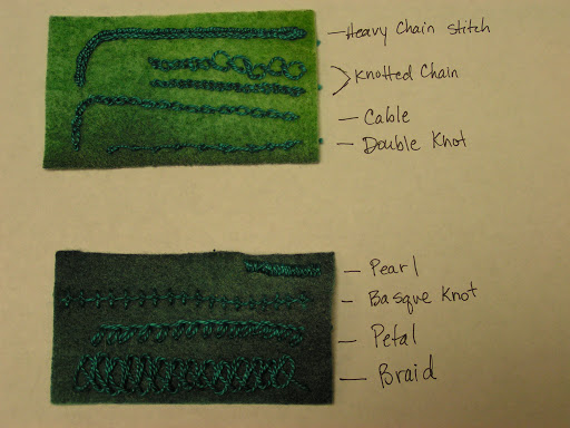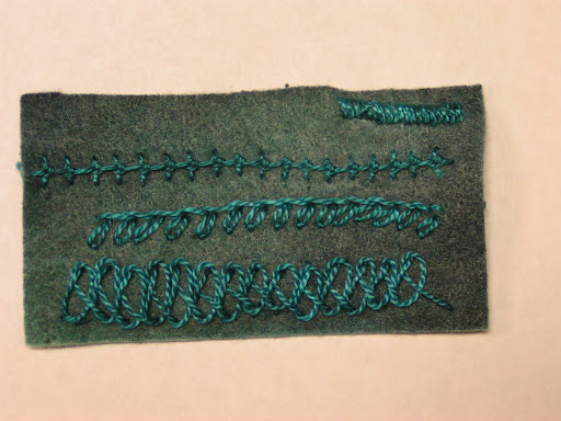 I worked on 8 different stitches today. (You can click on any of the photos to see the stitches more closely.) I wanted to try a few of the stitches that I hadn’t done before and see if any would be useful to me. For a stitch to be useful, it needs to be fairly straight forward and not take an age to work. The first stitch I tried was heavy chain stitch. Once I got going, it was an easy stitch. The most important part was to start with a long enough stitch so that you could thread the loop of the chain back through easily. I got off a little at the start but soon figured it out. It curves easily as well.