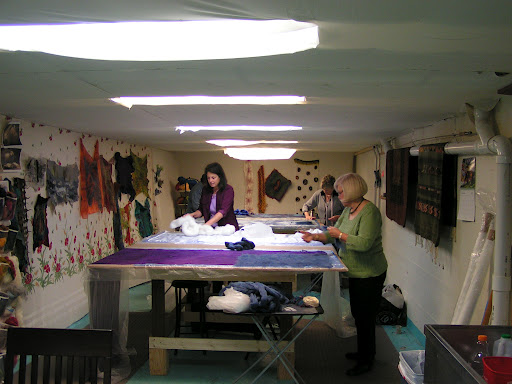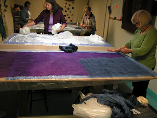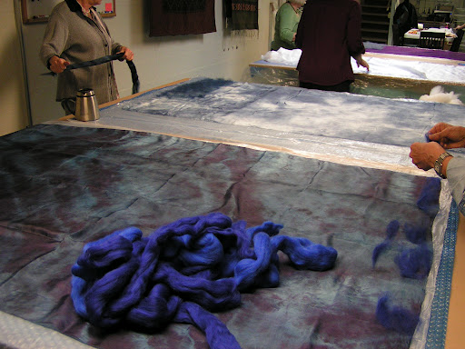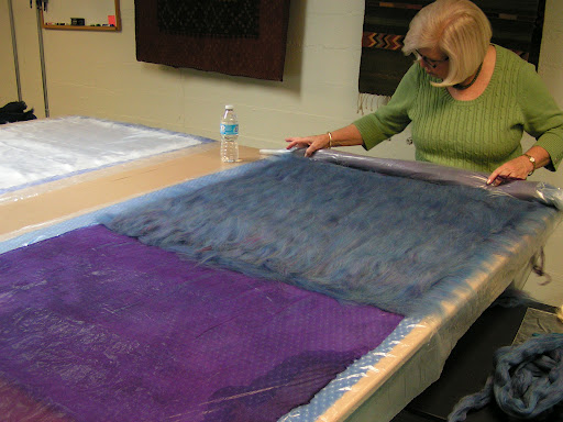Once the silk was completely covered I added Wensleydale locks as embellishment. If you don’t want a very textured surface, don’t add locks. They shrink differently than the merino and give a very textured effect. But I love texture so on with the locks.