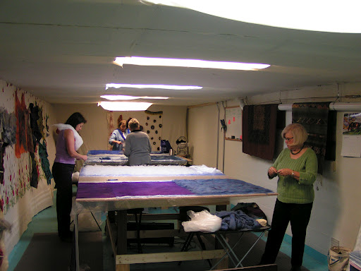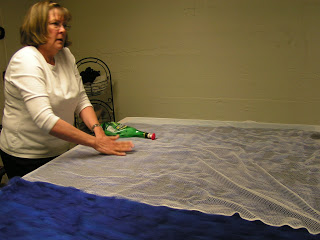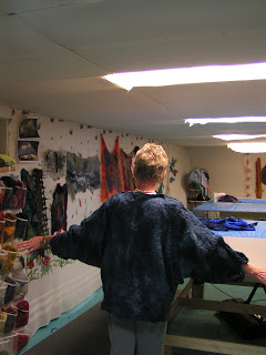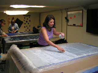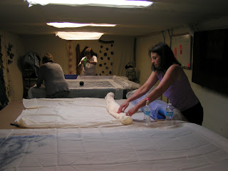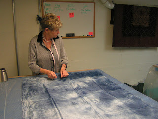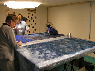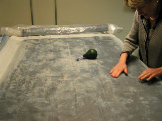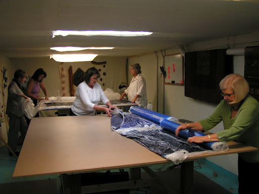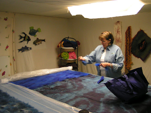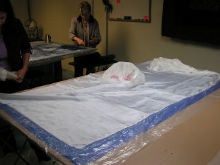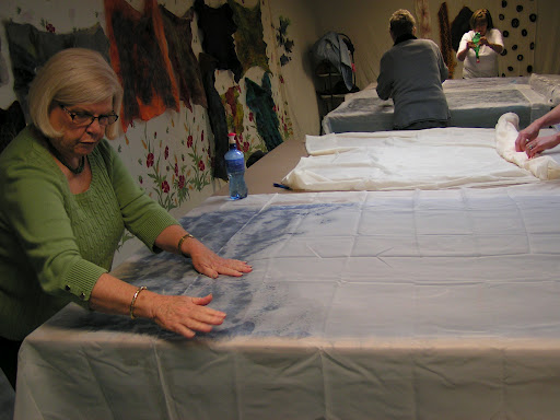 Then roll everything up in the pool cover or bubble wrap and tie with nylons. Then the rolling begins. Start rolling gently and avoid heavy pressure to start. I usually roll 50 times, unroll, and then roll up from the other end. I do that at least twice. Check between each roll and try to smooth out the wrinkles that develop in the plastic. Have towels handy for sopping up any errant water that comes out the end. After doing 4 x 50 rolls, I check to see if I see any fibers migrating through the silk. Look at the back side of the silk and see if you see little ‘hairs’. Sometimes you can see this better if you add more water or take water away by blotting with a towel. At this point, I flip the piece over so the back side is up and remove the top piece of plastic.