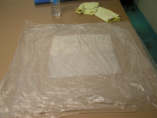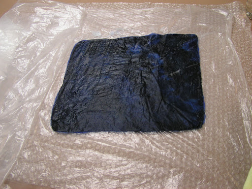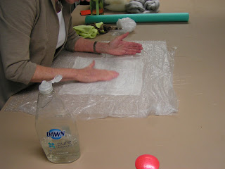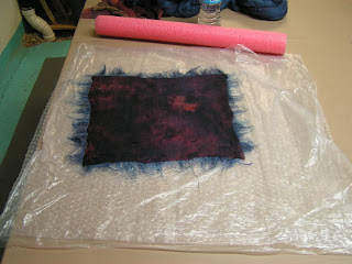 Here’s Julie doing a bit of rubbing to encourage those wool fibers through the silk. Julie is planning on dyeing her jacket after it’s completely felted.
