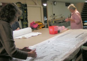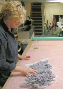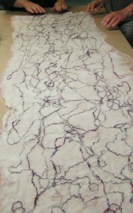This is Sally making her scarf. She used a cotton cheesecloth/scrim type material and merino mixed with silk. She had never nuno felted before but did a great job.