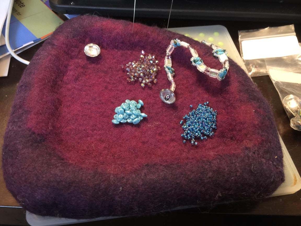 This first one is a felted beading bowl. I got the idea from Teri over at Teri Berry Creations. She calls them Sewer’s Friends. It was simple to make. This one had a triangular-shaped resist around the edge. Once it was felted and the resist was removed, I stuffed wool into the outside edge. You can put your beads or buttons in the center and your needles around the edge. This photo shows it at her house ready to be used. My sister makes beautiful beaded bracelets that I sell at the store.