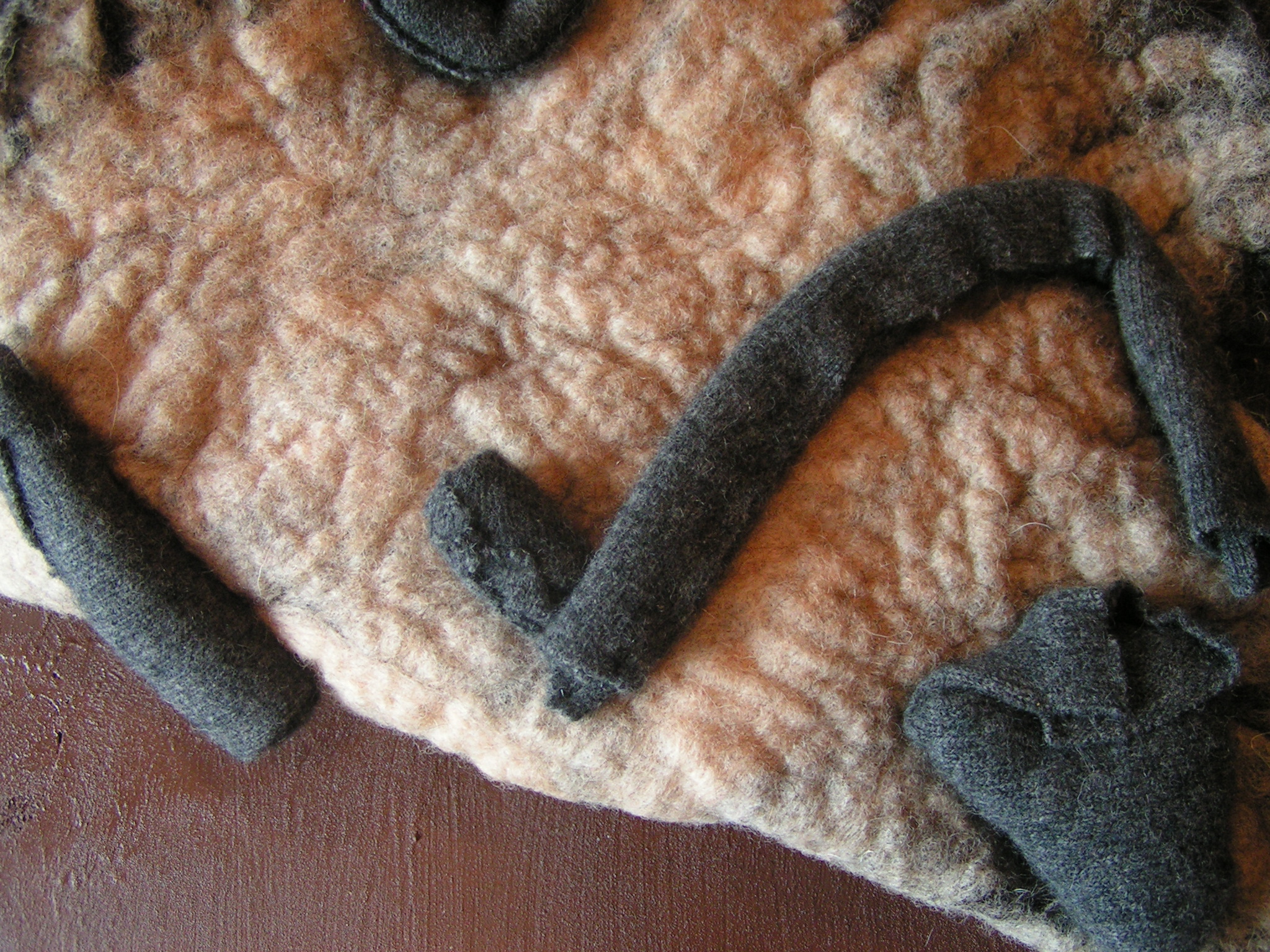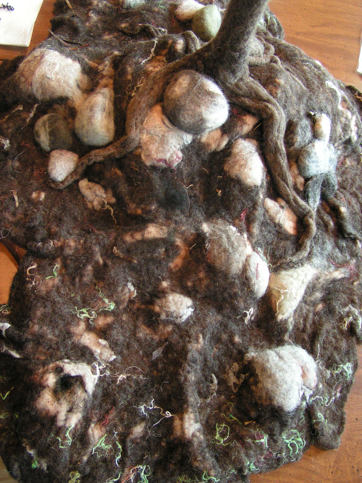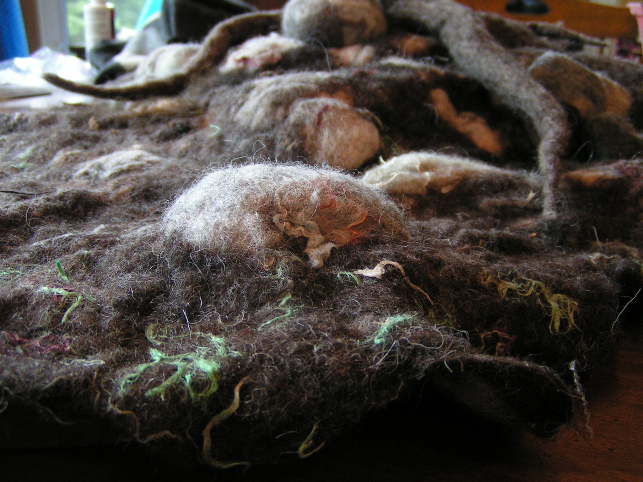 In this photo, you can see the rolled up pieces of sweater on the bottom of the felt. I just rolled it up and needle felted a little to hold the shape. Then I needled the ground felt down to the sweater pieces.