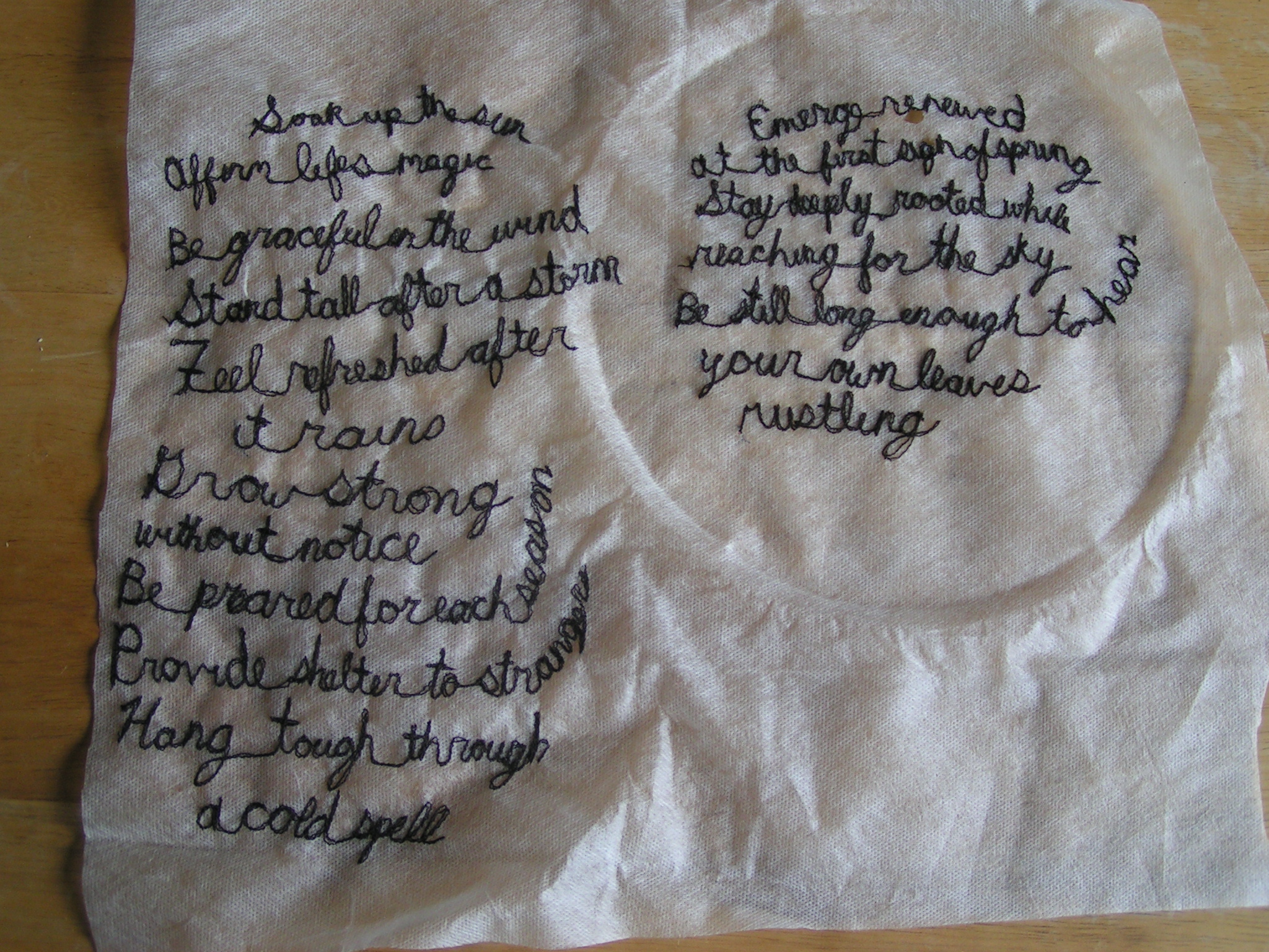 And this is the result. Stitching that vaguely looks like writing but you can’t really read it. Perfect for adding texture to my tree trunk. Now I just have to attach the lines of poetry. I will most likely stitch them on but I haven’t tried it yet. I could always glue them but I thought stitching would hold better.