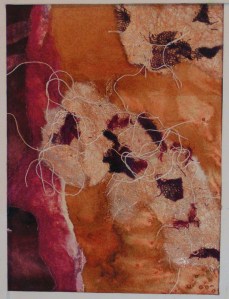 Here’s another collage I did. The background is stamped and painted fusible adhered to black paper. I cut the leaves from my other piece of fused paper/fabric.
