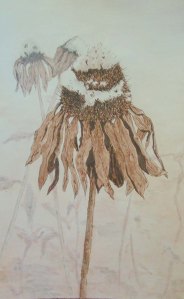 Here’s a sketch of a cone flower in front of my house with the first snow. I used a variety of media including sepia pens, watercolor and acrylic paint. I’m pleased with the result and it looks like a cold, fall day in Montana.