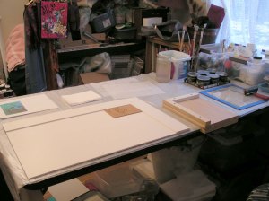 Here’s my inking station. I am planning on 5 colors for this print. I am also trying this Speedball Professional Ink for the first time. I hope I like it since hubby got me a lot! It cleans up with soap and water which I really needed as I can’t really do other chemicals in the bedroom/studio very well.