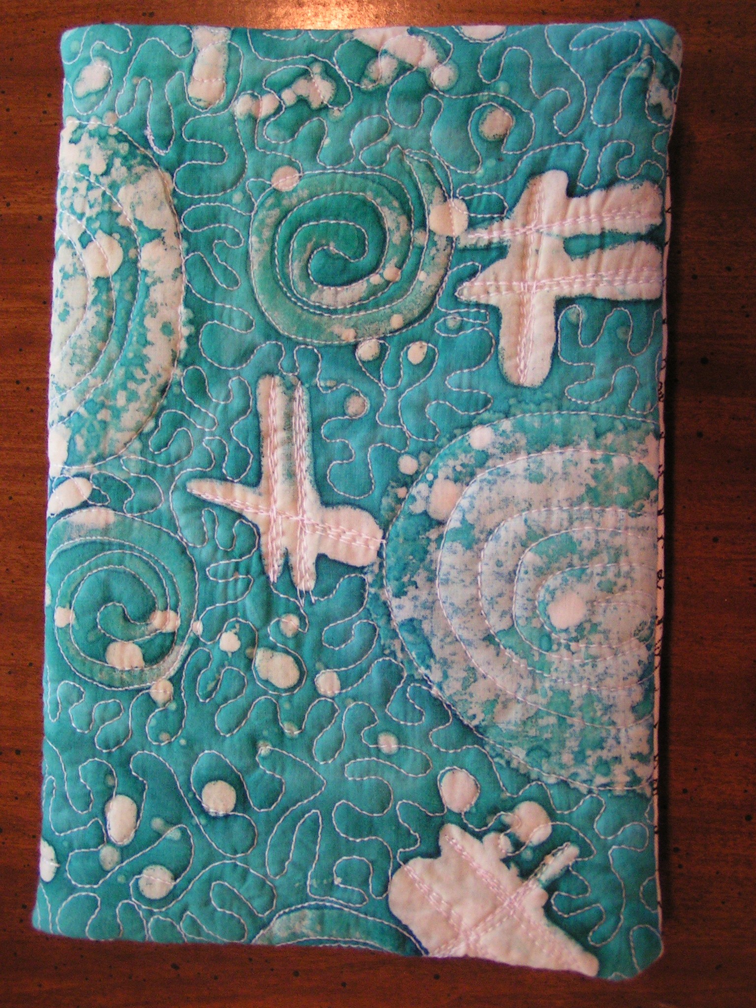 I am still writing my next online class and this is one of my samples. This is stitched on heavy interfacing instead of felt but it’s just for practice. I stitched this last week but I added some Dye-Na-Flow paint today. The painted background really makes it look more interesting. The paint is still wet in this photo so I’m not sure how it will turn out since I wet the interfacing down before painting. That allows the paint to move much more freely. And it will probably be a bit lighter in color when dry.