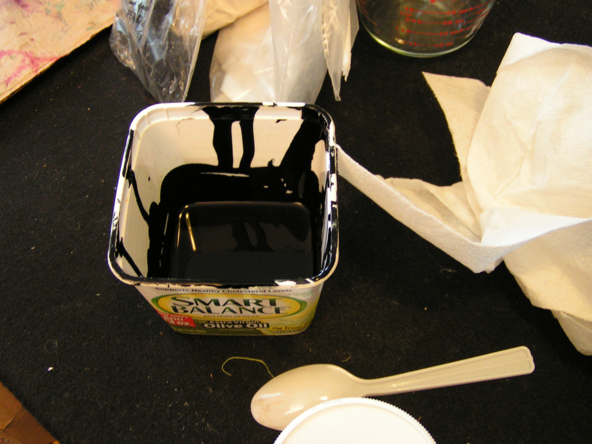 Then I added dye powder to a very small amount of print paste. This is the black one and I also mixed a green. We’ll add more colors later when we screen through the readied screens.