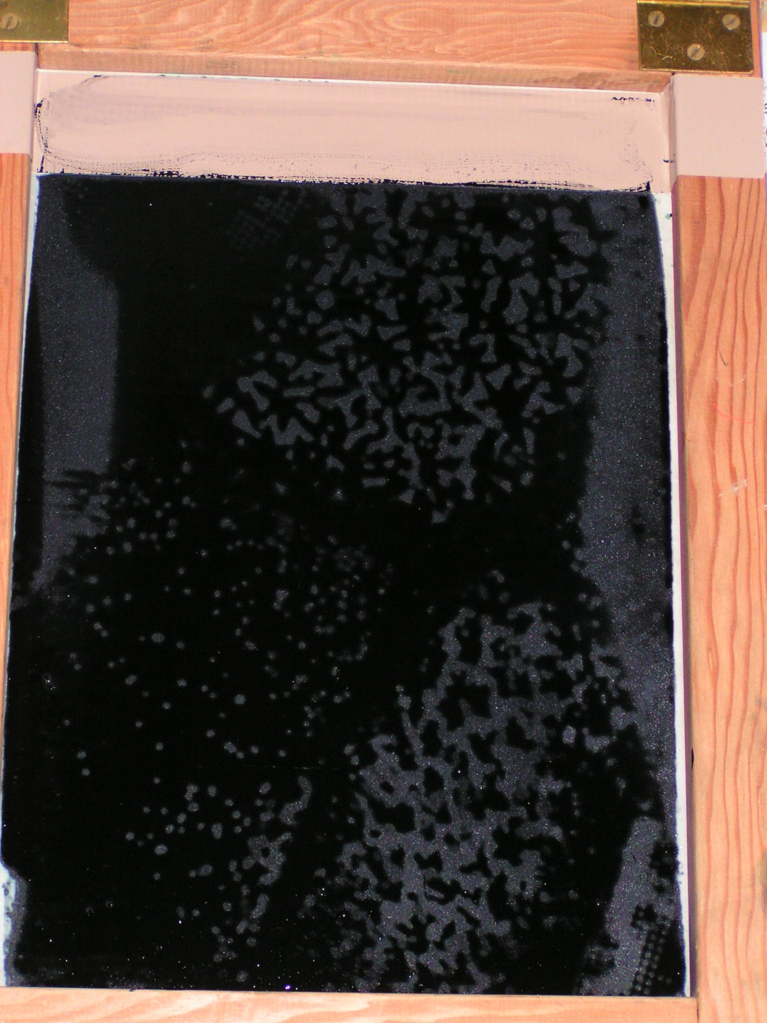 If you enlarge the photo above, you’ll be able to see that there is texture on the screen. I put commercial texture plates under there. Then I screened the black thickened dye over the screen and let it dry.