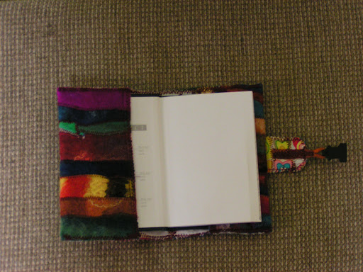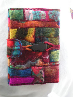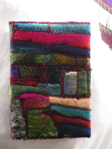 I have been getting goodies in the mail. This beautiful notebook cover with address book inside is from Zed. Now that I look at the photo, I think it’s upside down but you get the idea. She’s used a bunch of felt scraps and stitched them together. The closure is great.