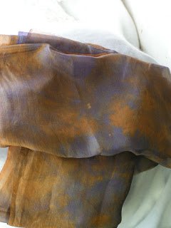 This is a photo of a scarf that I silk painted when our local surface design group met in November. Louise has a steamer so she volunteered to steam our work so it would be wash safe. This scarf is a wool and silk blend and it came out better than expected.