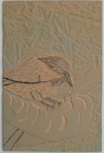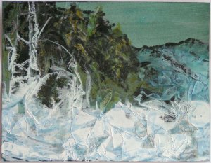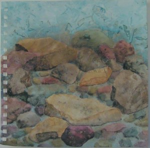 So here are the added underwater rocks. I just made them sort of fuzzy shapes with indistinct edges. Since this is all in water color over a base of acrylic paint, the watercolor comes right off if you get it wet. So I needed to spray it with a fixative so that I could continue to work over the top and add the water flowing. Of course, I don’t have any spray fixative. I tried to find it in four local stores and no luck. So I ordered it off of Amazon. Now I have to wait until next week to finish this piece. I guess that gives me more time to study flowing water and how to paint it!