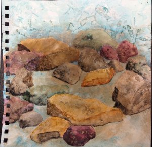I then added water colors to create the rock shapes. So far so good. The gesso textures really helped to give the rocks some character. But now I decided I needed to add water and make it look like a river bed with water flowing over and around the rocks. Uh oh, now I would need to figure out how to paint water. I watched several Youtube videos and printed out some photos of river beds in Montana. The rock colors are similar to what we have here.