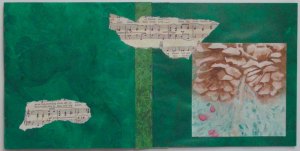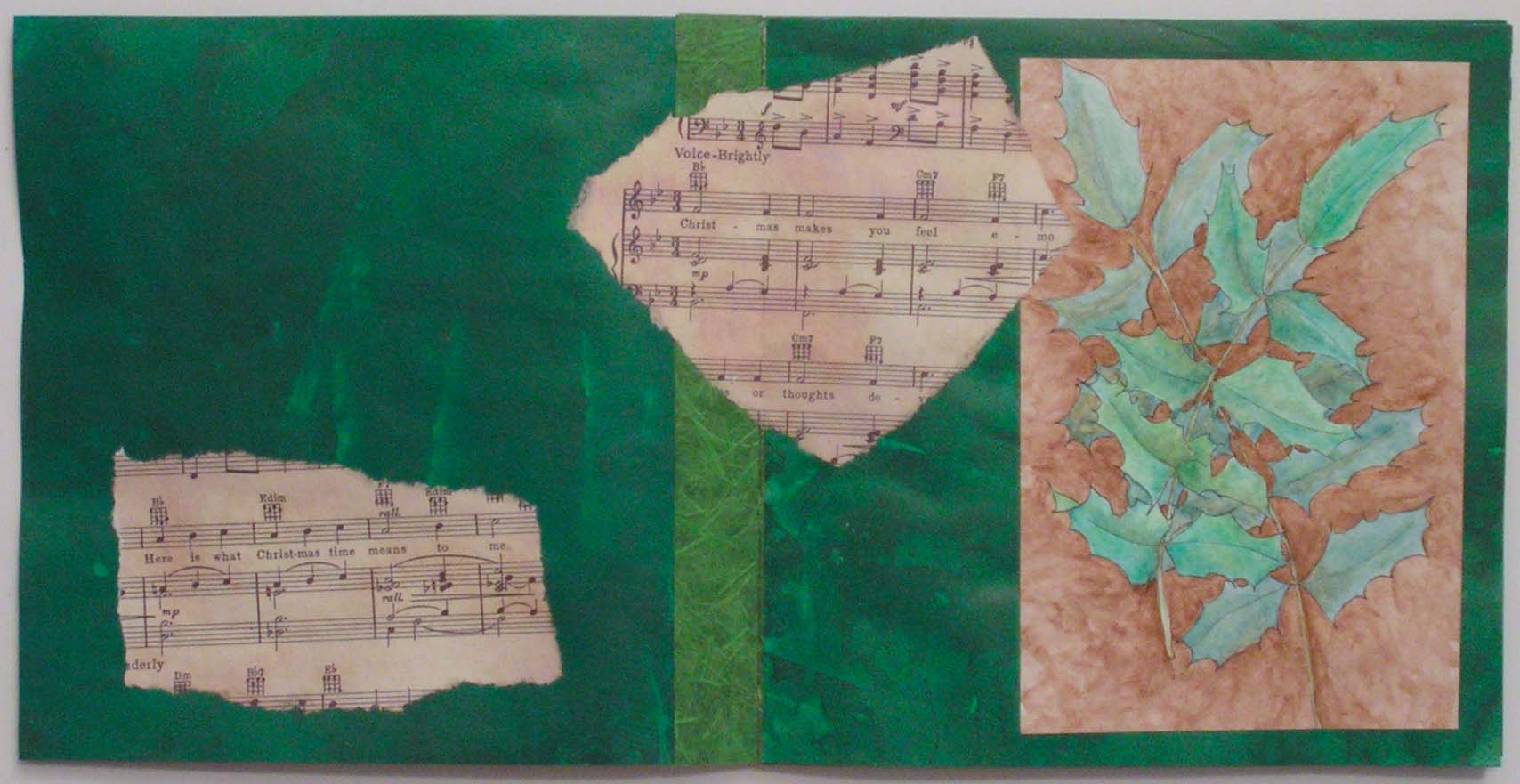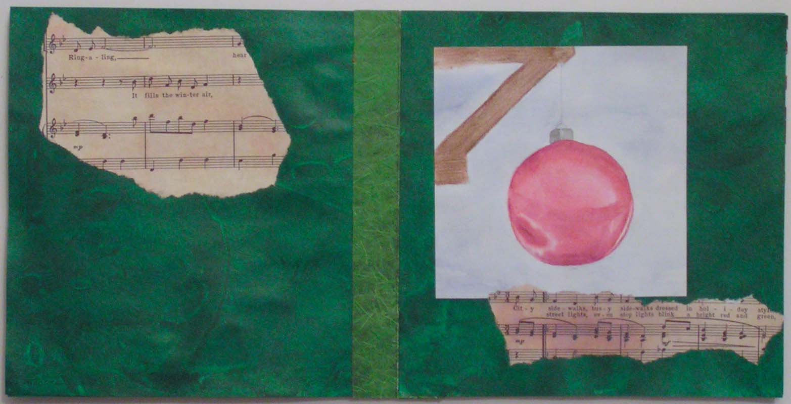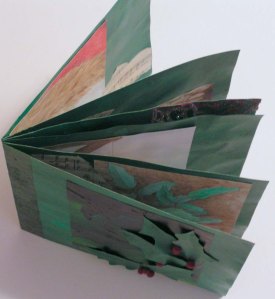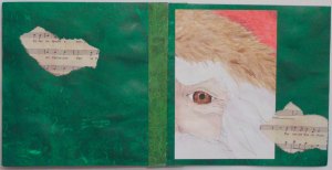 Here’s the front cover. I used some little red felt balls for holly berries and covered them with glazing medium.