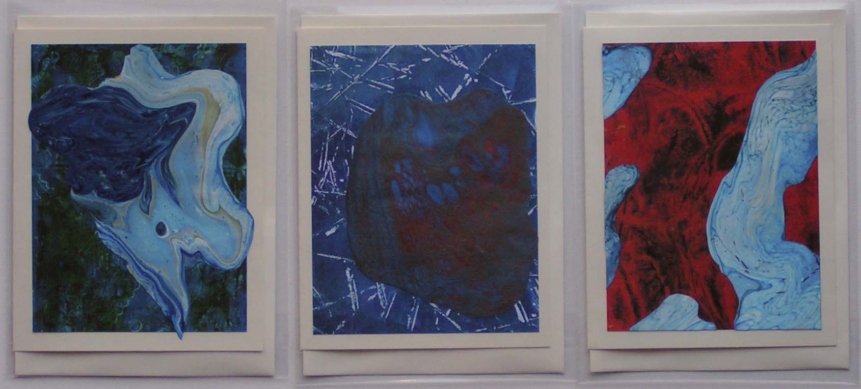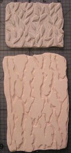 This one is two layers with blue over orange-yellow through a stencil that is supposed to represent bark. It looks too much like an animal print to me though. I switched to the high flow Golden acrylics and really liked the way they printed better than the standard acrylics. They don’t dry out as quickly either.