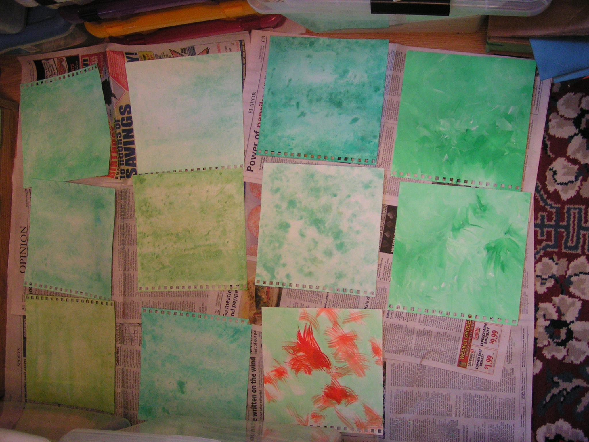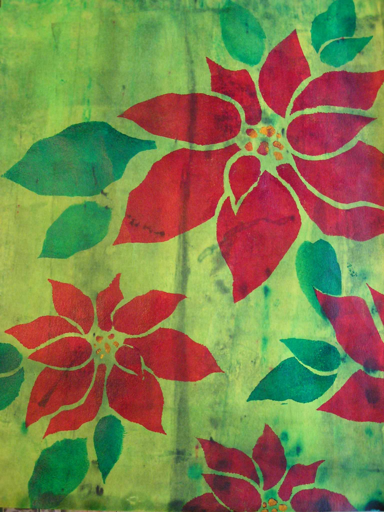 I used one of my silk screened pages and stenciled a few poinsettias on the page. I used a portion of the stencil with green to make the leaves. I think this will make a nice Christmas card. I can scan it in, add some text and I’ll have a nice digital card.
