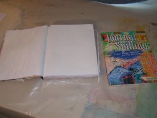 When the local Borders store went out of business, I bought several books for half price including Journal Spilling by Diana Trout. I also found a journal for 60% off. I glued two pages together to make the paper thicker and then added a coat of gesso. I think I’ll do a bunch of pages so that they are all ready to go.