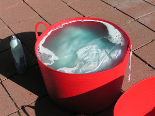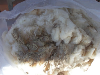 Then I drained out the excess water in the spin cycle of the washing machine and put it out to dry on my improvised drying rack. It was a beautiful day today so I got to do this all outside. Makes it nice as although hubby is supportive, he doesn’t care for Eau de Sheep Poop all over the house.