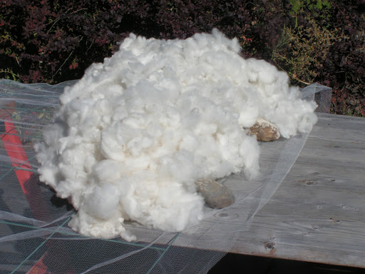 Then I drained out the excess water in the spin cycle of the washing machine and put it out to dry on my improvised drying rack. It was a beautiful day today so I got to do this all outside. Makes it nice as although hubby is supportive, he doesn’t care for Eau de Sheep Poop all over the house.