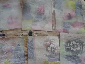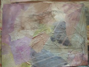 This is the start of my newest project. It’s going to be a book for Rita, my mother-in-law for her birthday. It has mixed media pages and a felted fabric collage cover. So I started with the pages and covered them with a mix of tissue papers, paper towels, threads and scrim.
