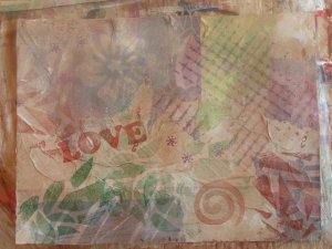 Here’s the next step to complete the backgrounds for my book pages. I scraped various colors of paint on with a credit card. Very technical painting here =0)
