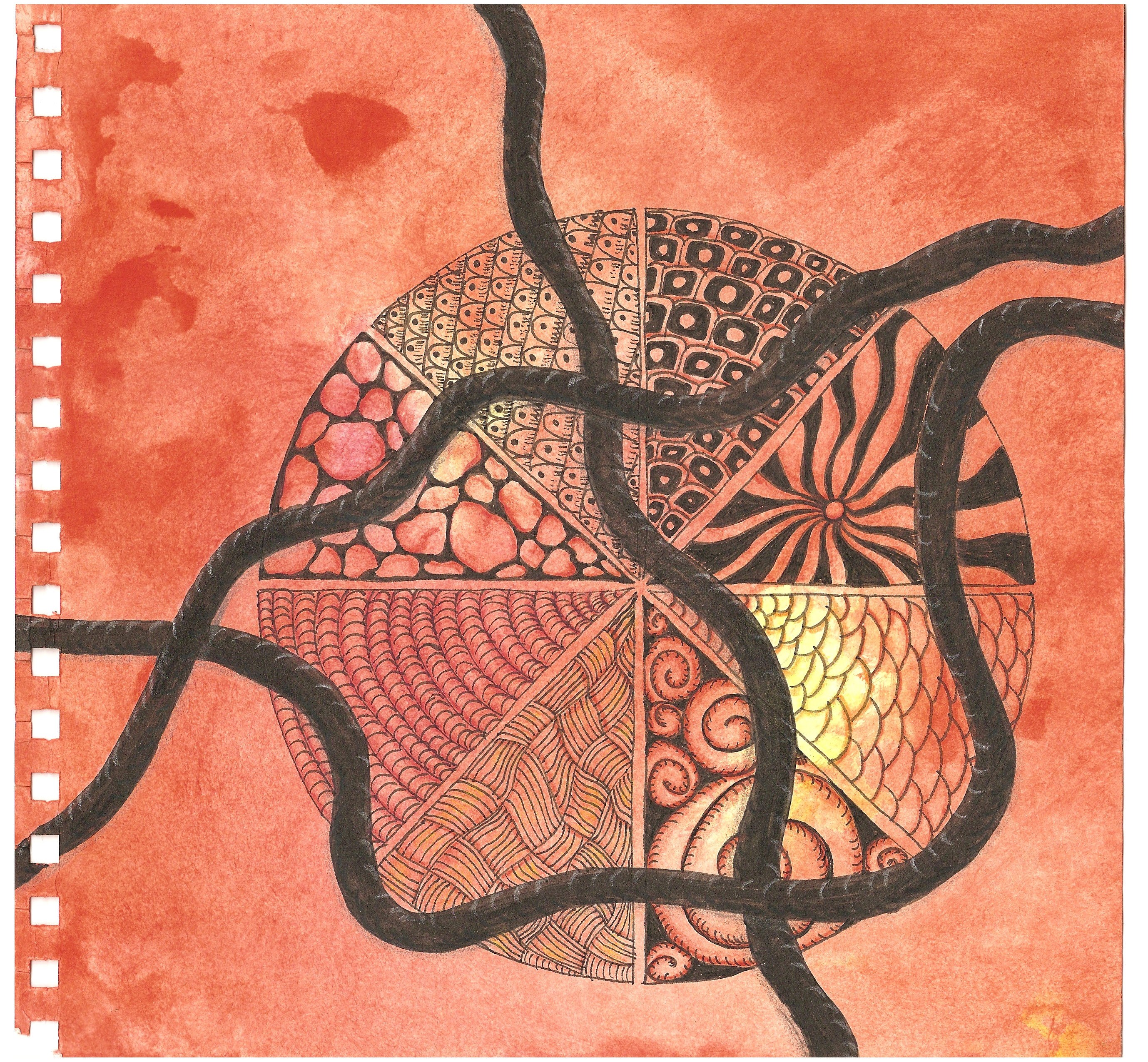 This one was cutting the circle up into wedges and then filling the wedges with Zentangles. I added the black lines on top to add a little interest to the page.