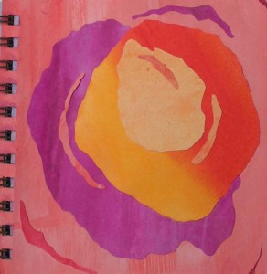 This one was an experiment with wet paper that I pushed on to a textured rolling pin. Then I painted it to go with the page. I’m not sure how I got the yellow “explosion” on the right side of the page but I didn’t do it on purpose.