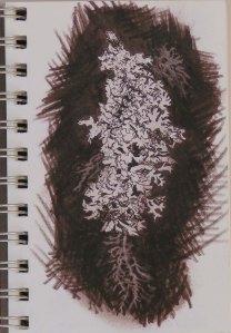 The next try was lichen on a small branch. It’s hard to see the colors on this one but they were pretty close. It’s just there is so much darkness in between the little lichen bits it’s hard to see. I did the sketch with sepia pen and white colored pencil. This was about filling in the negative space with the dark background and leaving the lighter spaces with just a little bit of color.
