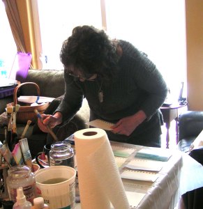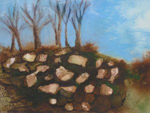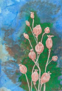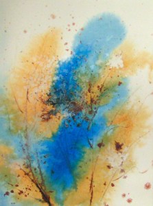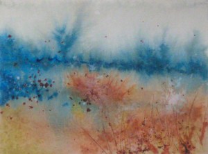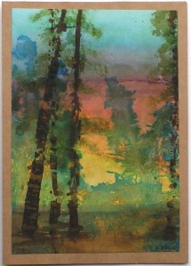 This started out as a bigger painting that was 9″ x 12″. It wasn’t very good so I cut out the best bit, toned down the colors slightly and it looks better in a small format. I was experimenting with various ways to paint pine trees. I used different bits of fabric in the paint and then pulled them off after the paint dried. I will have to try this again on a sky that isn’t so over the top and vibrant.