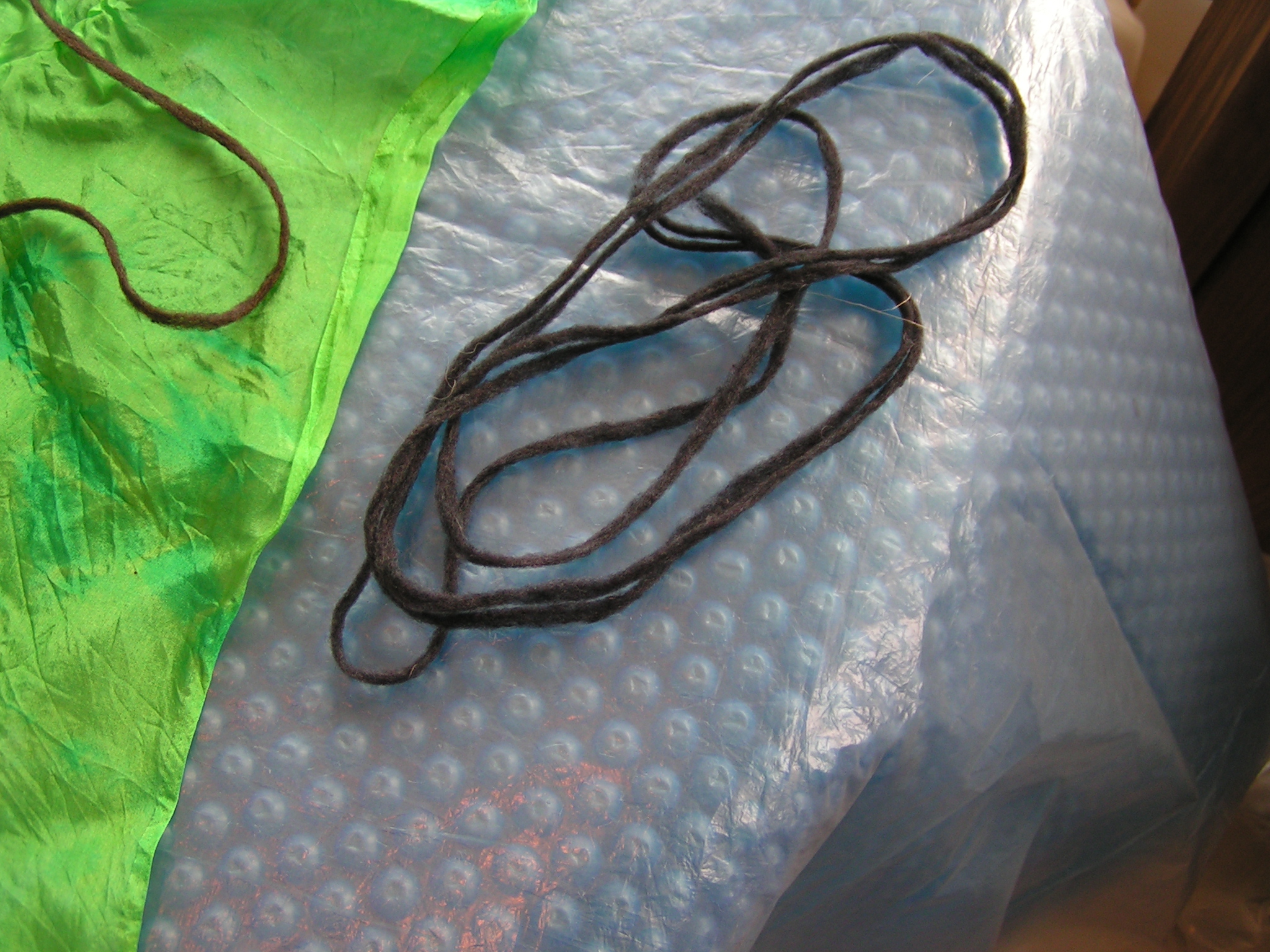 Then roll everything up in the pool cover or bubble wrap and tie with nylons. Then the rolling begins. Start rolling gently and avoid heavy pressure to start. I usually roll 50 times, unroll, and then roll up from the other end. I do that at least twice. Check between each roll and try to smooth out the wrinkles that develop in the plastic. Have towels handy for sopping up any errant water that comes out the end. After doing 4 x 50 rolls, I check to see if I see any fibers migrating through the silk. Look at the back side of the silk and see if you see little ‘hairs’. Sometimes you can see this better if you add more water or take water away by blotting with a towel. At this point, I flip the piece over so the back side is up and remove the top piece of plastic.