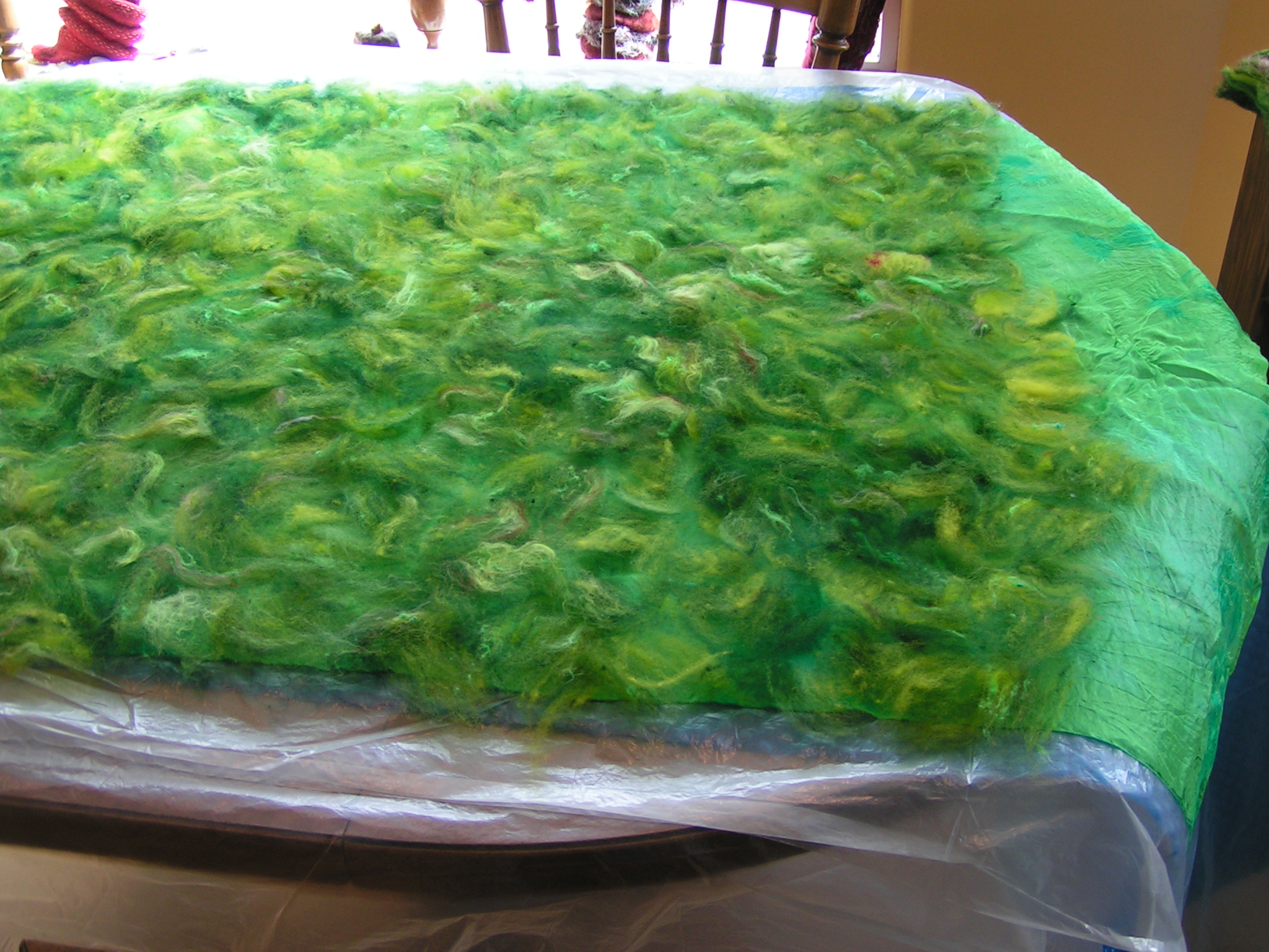 Next I wet down the entire top surface. I used cool, soapy water sprayed from a ball brauser type sprayer. Avoid hot water as you don’t want the wool to felt to itself before the fibers migrate through the silk. I gently pat the wool down as I wet it to make sure all the air bubbles are out and that the wool is completely wet. The photo above you can see the preyarn lines showing from the other side so there really isn’t a lot of wool here, just a small, light layer of wool. Once you’ve got the entire surface wet down, cover the whole piece with thin painter’s plastic.