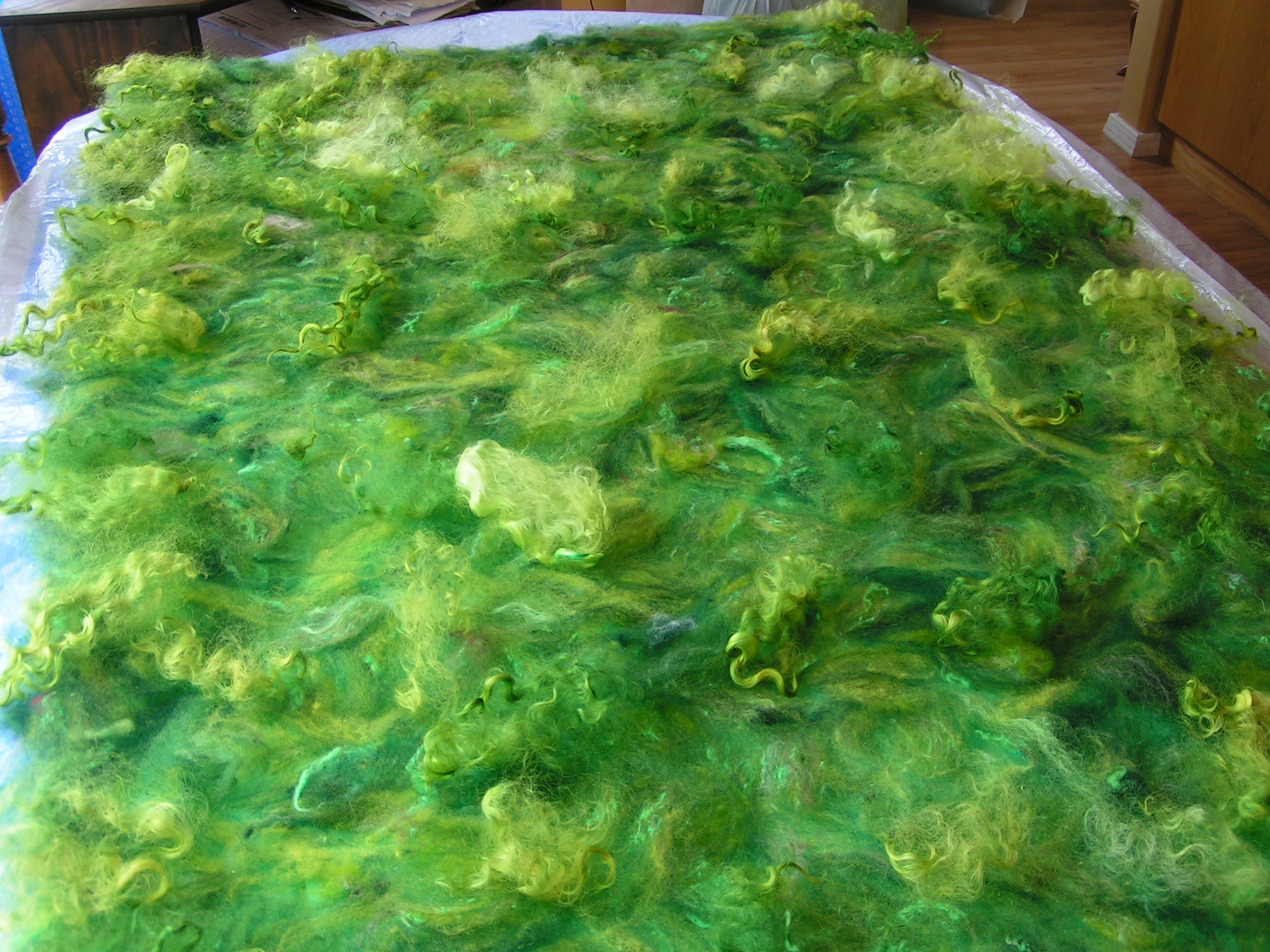 Once the silk was completely covered I added Wensleydale locks as embellishment. If you don’t want a very textured surface, don’t add locks. They shrink differently than the merino and give a very textured effect. But I love texture so on with the locks.